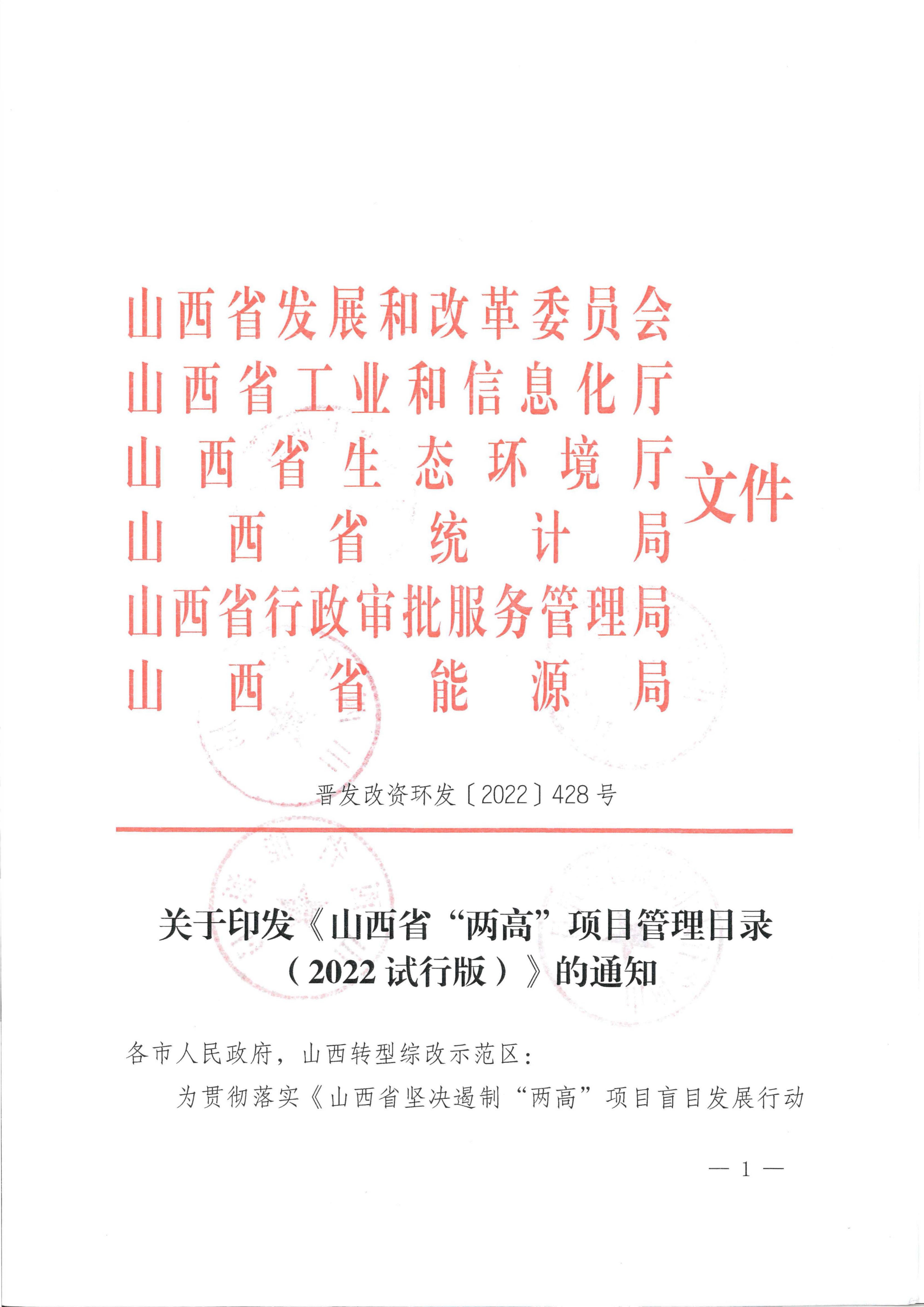 关于印发《山西省“两高”项目管理目录(2022试行版)》的通知